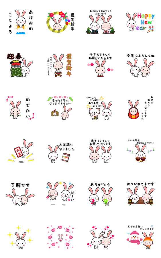 大人かわいいうさぎのスタンプです。お正月のご挨拶・年末のご挨拶・ラブラブ・日常使い入りです。※2023/1/3(火)23:59までに購入すると特典「LINEおみくじ」がもらえます。