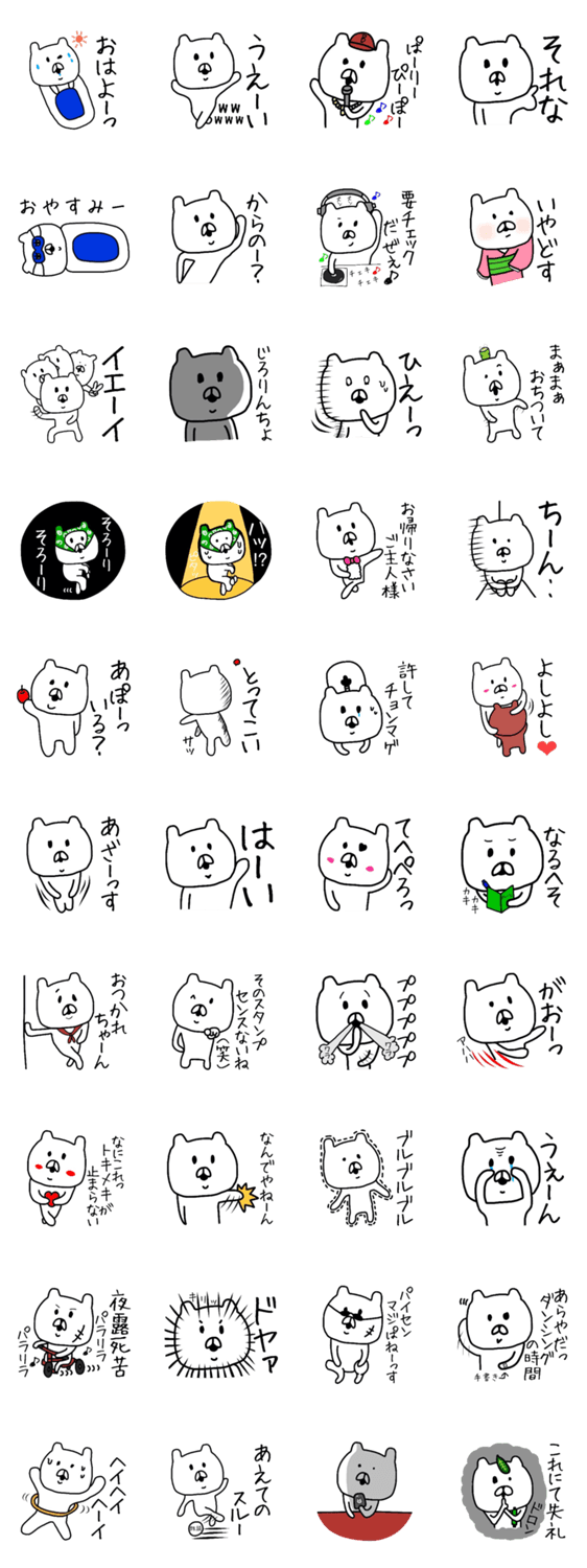 | スタンプ説明 | ネコではなく、白いくまです。日時会話など誰でも使いやすいスタンプですが、ふざけたり煽ったりもします。ゆるくてウザいですがご容赦下さい。 |