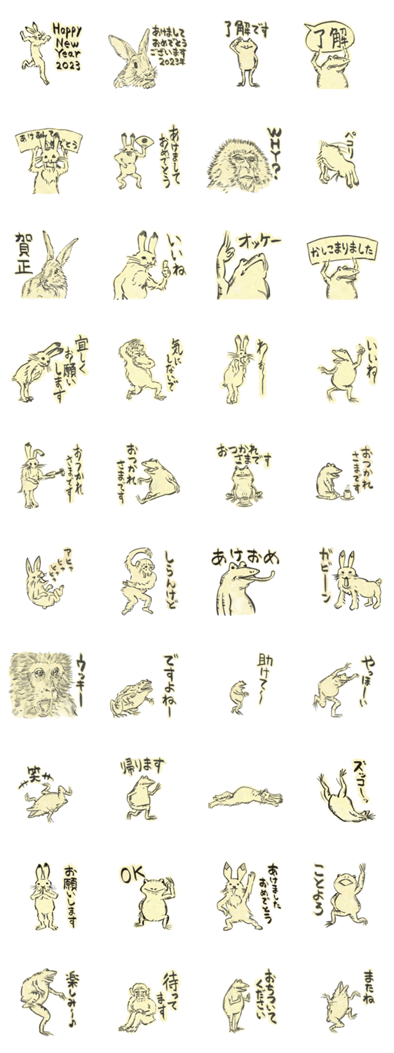 筆で描かれた兎や蛙や猿。2023年の新年のあいさつと毎日つかえる、おつかれさま、いいね、ペコリ、了解です、帰ります。リアルなサルやうさぎもあります。※2023/1/3(火)23:59までに購入すると特典「LINEおみくじ」がもらえます。