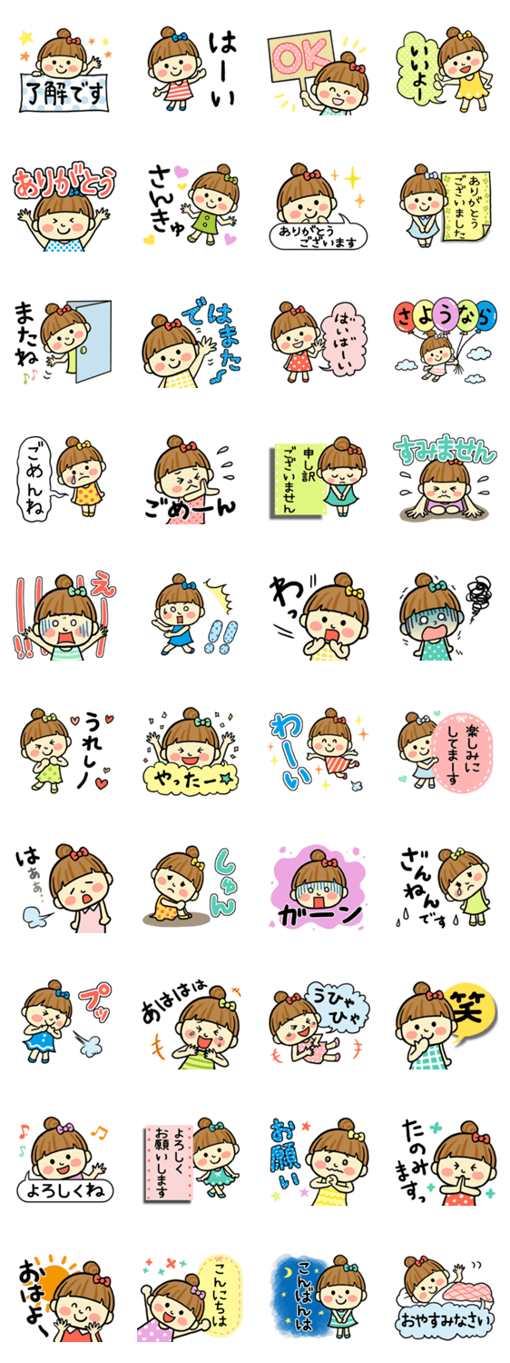 パッツン前髪のかわいいおだんご女子です。敬語やタメ口などいろんな文字入りスタンプで使いやすいです♪