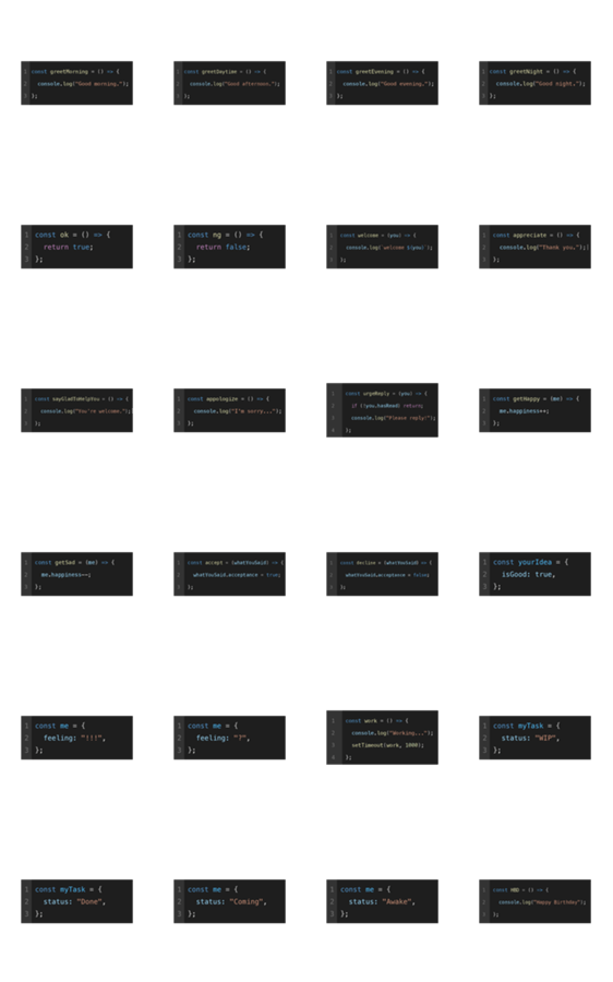 動くプログラミングスタンプ第3弾が登場! JavaScriptであなたの思いを伝えるスタンプです。 ※本スタンプはES6で記述しています。