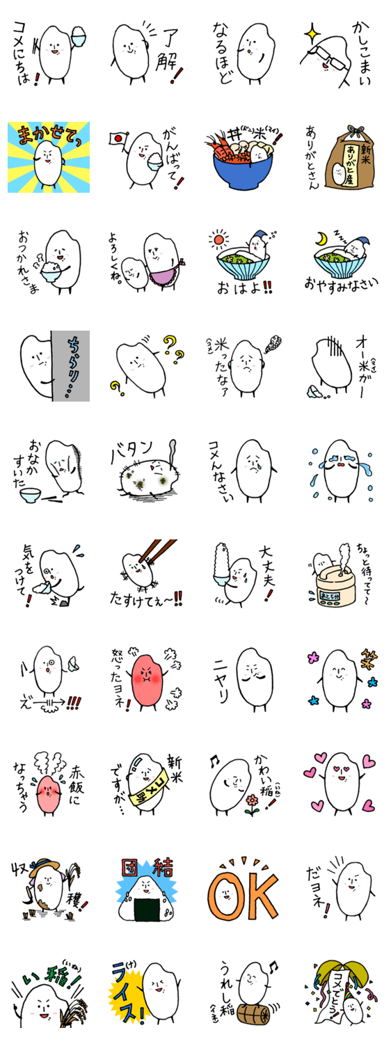 | スタンプ説明 | コメにちは!コメ助です。お米のキャラクターなんだヨネ。みんな、スタンプ使ってくれたらうれし稲(いね)! |