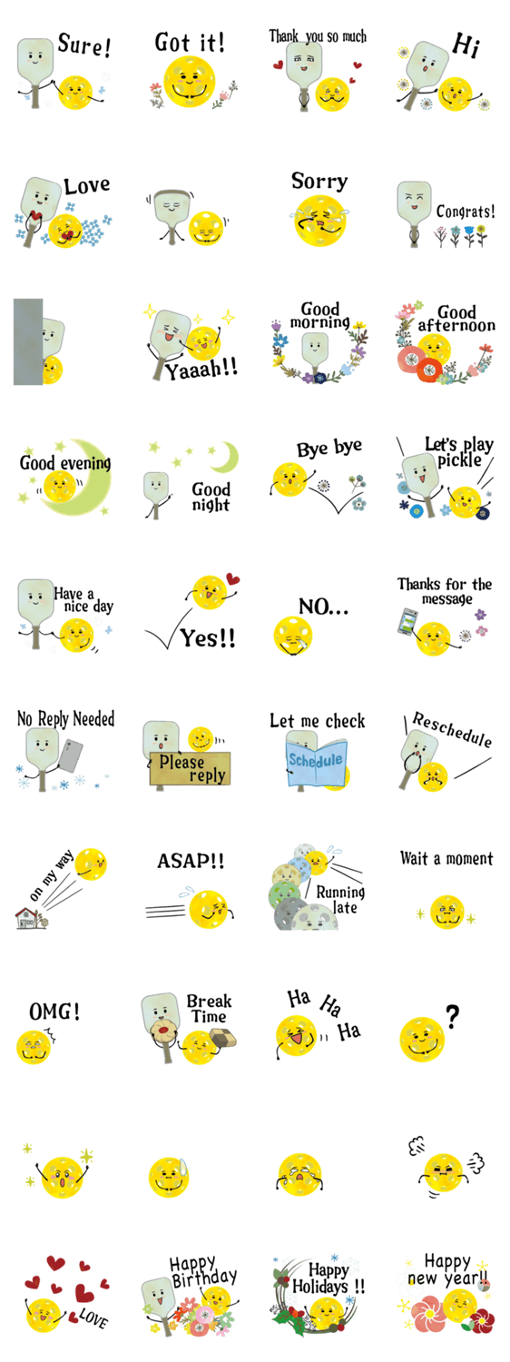 ピックルボール(黄色)のスタンプ。チームの仲間と連絡や、日常会話に便利なセリフのセットです。