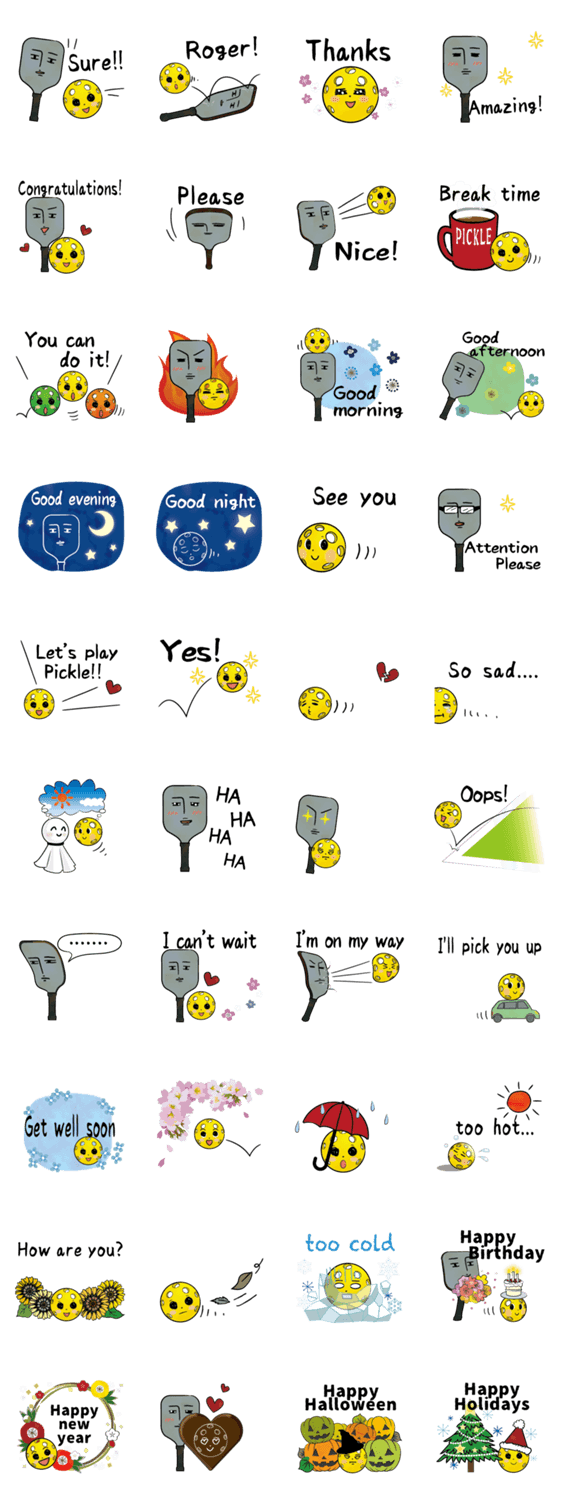 ピックルボール(黄色)のスタンプ。チームの仲間と連絡や、日常会話に便利なセリフのセットです。