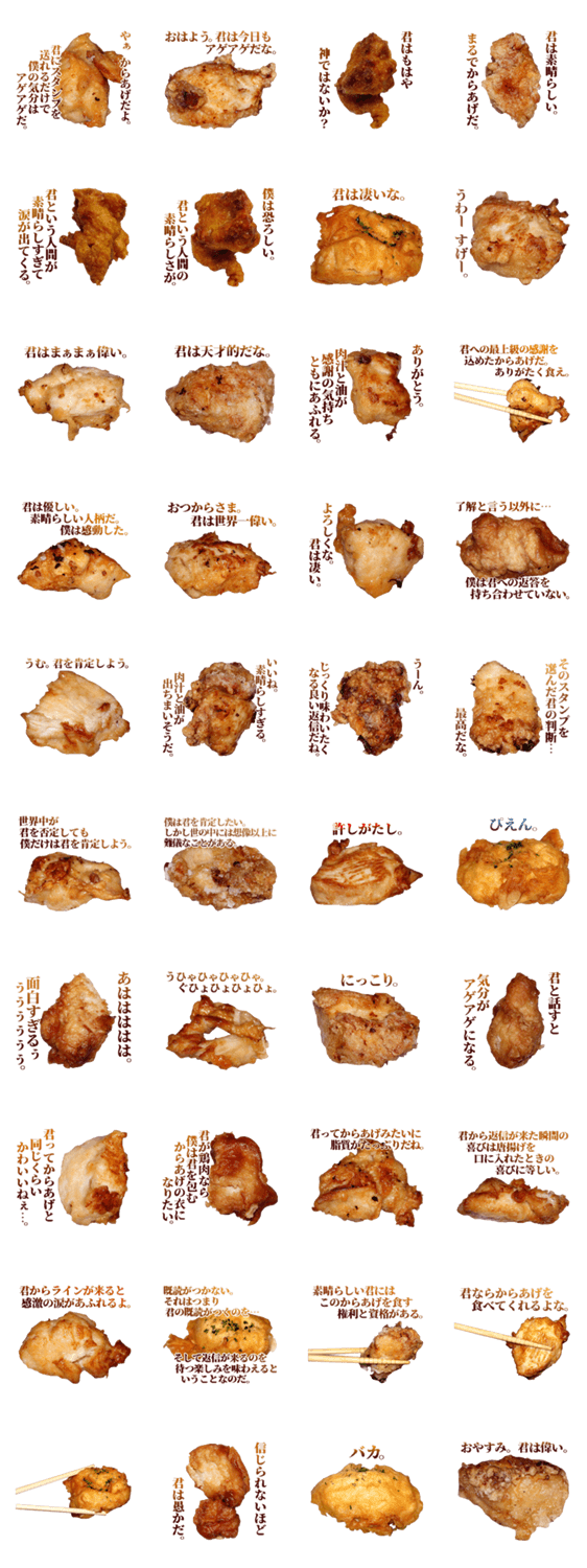 からあげがすべて肯定してしまうスタンプです。肯定は最強のコミュニケーション。飯テロ、鶏肉、唐揚げ、カラアゲ、フライドチキン、揚げ物。実写・写真食べ物シリーズ。