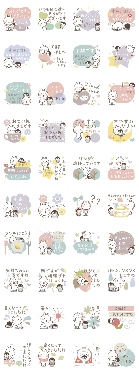 年中使える敬語で長文の大人可愛いうさぎとゆるぺんです。 くすみカラーのスタンプです♪