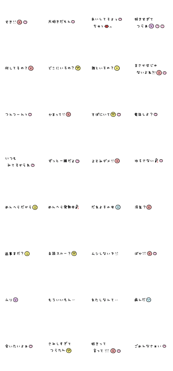大人可愛い言葉のシンプルな省スペーススタンプです。白抜き文字なのでトークの背景が黒くても見えます!めんへら/大好き/浮気/どこにいるの/かまって/さみしい/作:さあや
