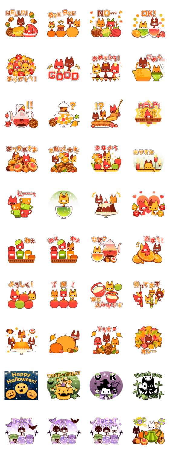 | スタンプ説明 | 美味しい食べ物に楽しいハロウィン!あなたのトークを秋らしく彩るネコたちのスタンプ♪ |