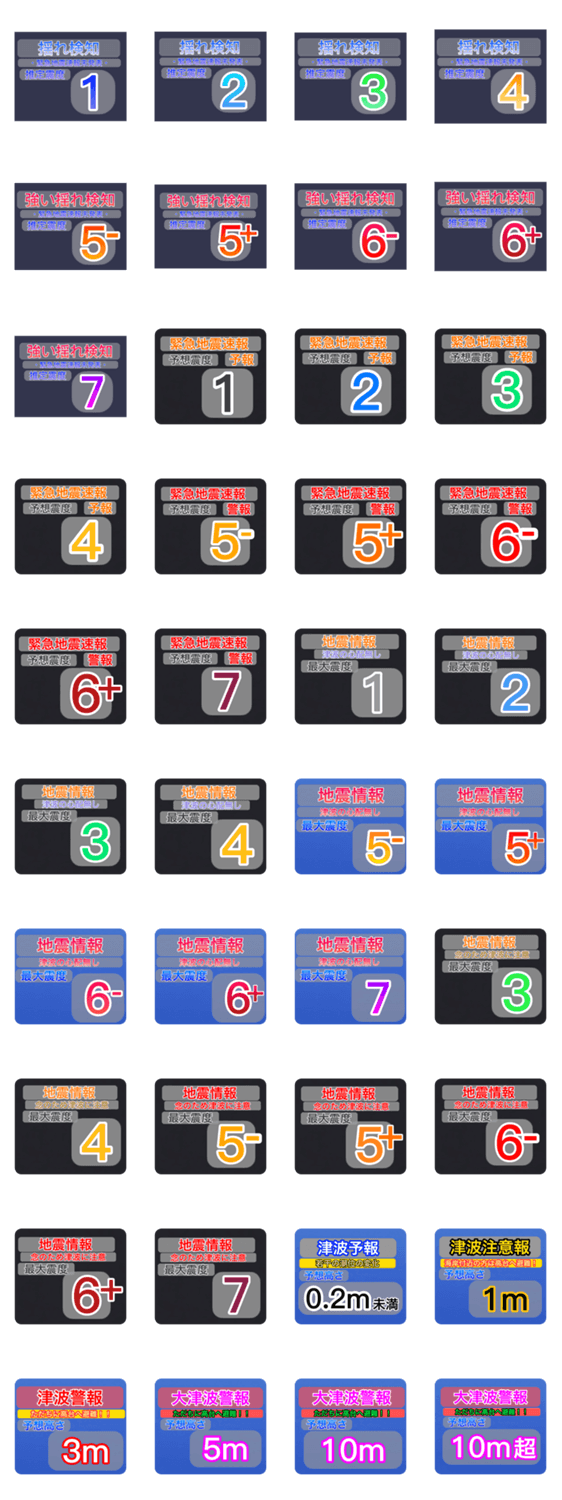 緊急地震速報・地震情報・地震検知スタンプです。制作著作:地震情報24tp 制作番号5 + 6-1