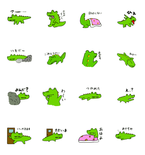 日常会話で使えるとぼけた表情のワニスタンプです。