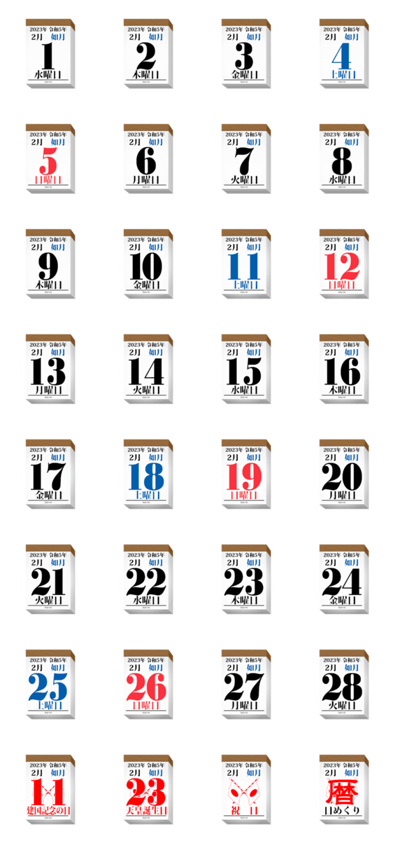 日本対応の暦のステッカーを作りました。2023年2月のセットです。