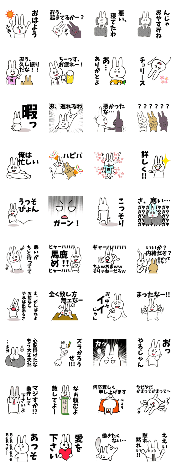 日常で使える、邪悪なうさぎ達のスタンプです。言葉が多めになっておりますので、文章を打つのが面倒な時にも便利です。男女共にお使い頂けます。