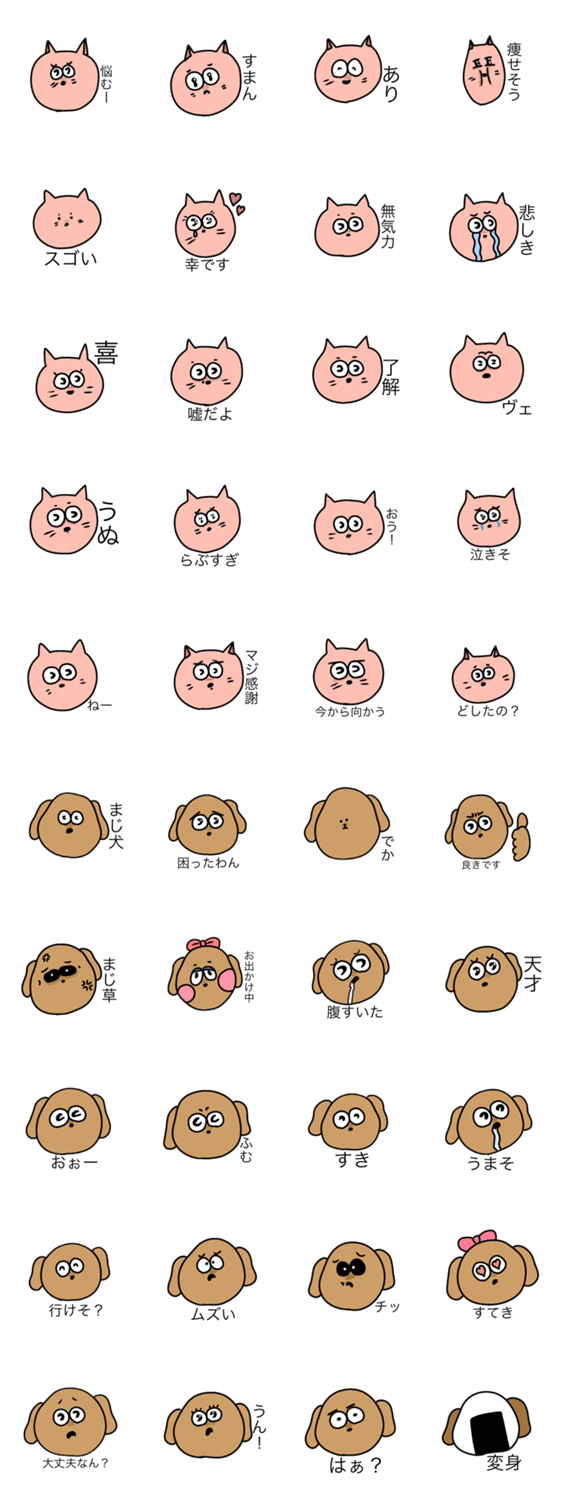 とてもシンプルで日常会話で使いやすい、猫ちゃんとわんちゃんのスタンプです!