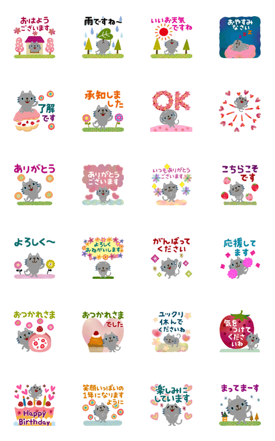 カラフルなポップアップねこねこスタンプです。 ありがとう、おつかれさま、よろしくなど、日常会話に使いやすい言葉を集めています。
