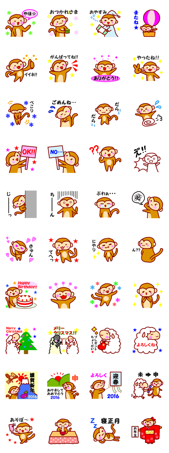 | スタンプ説明 | うきうきおさるさんのかわいいスタンプです。ひつじのメイちゃんもいるよ。クリスマスや2016年お正月にもどうぞ! |