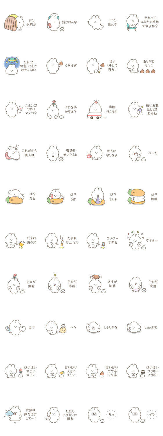 絶望ちゃんシリーズのうさぎ版・絶望うさぎ第2弾。悪口/馬鹿/バカ/酒クズ/ヤニカス/無能/論破/挑発/変態/うんち/うんこ/ブラボー/知らんけど/小さいスタンプ/省スペース