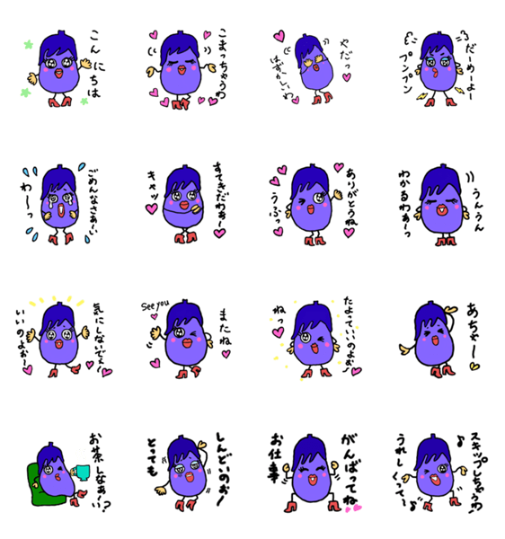 ちょっぴりクセありの面白可愛いスタンプです。ナス美ちゃんです。