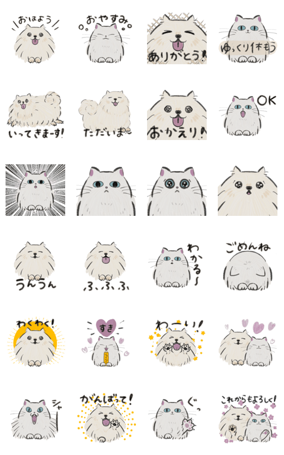 ぽっちゃり猫とポメラニアンの仲良しスタンプです。