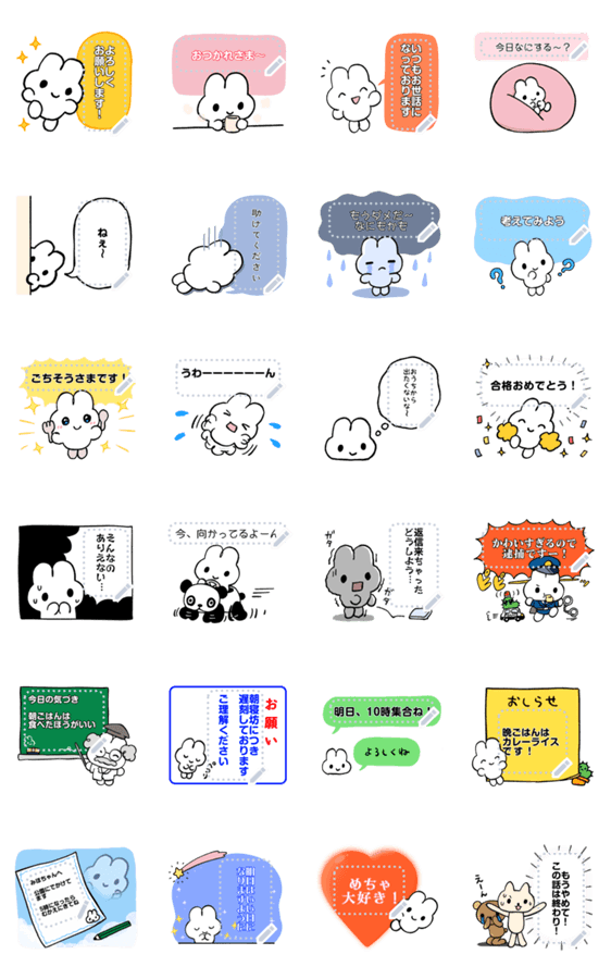敬語も、タメ語も、博士語もなんでも自由に伝えることができちゃう。やさうさちゃんのメッセージスタンプです。 現在この商品は一部のスマートフォン版LINE 10.3.0以上のトークルームでのみ使用できます。動作環境の最新情報はヘルプをご確認ください。