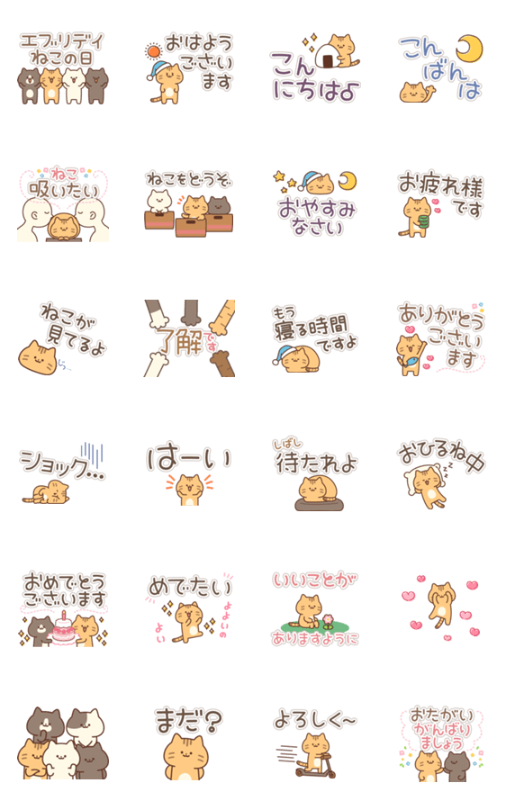 茶トラ、時々ハチワレ、黒猫、白猫…のネコの日に使えないこともない大きめ文字のシンプルな飛び出して動くスタンプです!