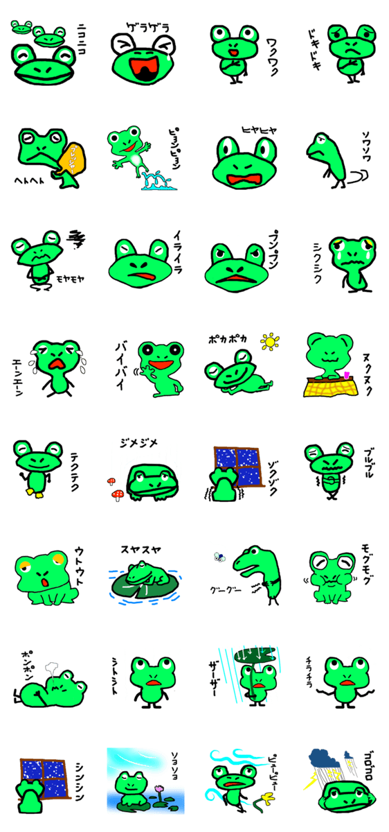 スタンプ説明 カエルの周りのオノマトペ