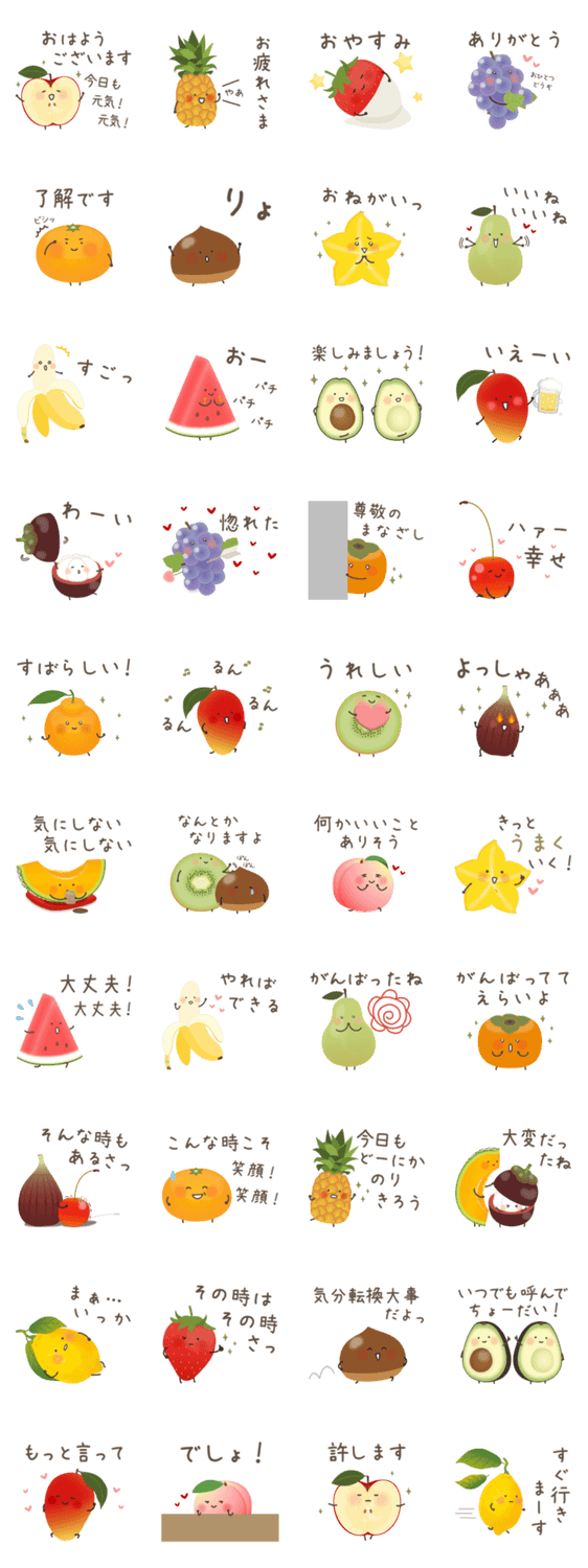 ゆるいフルーツたちの送りあうだけでポジティブになれるスタンプです。褒め言葉も入ってるよ♪