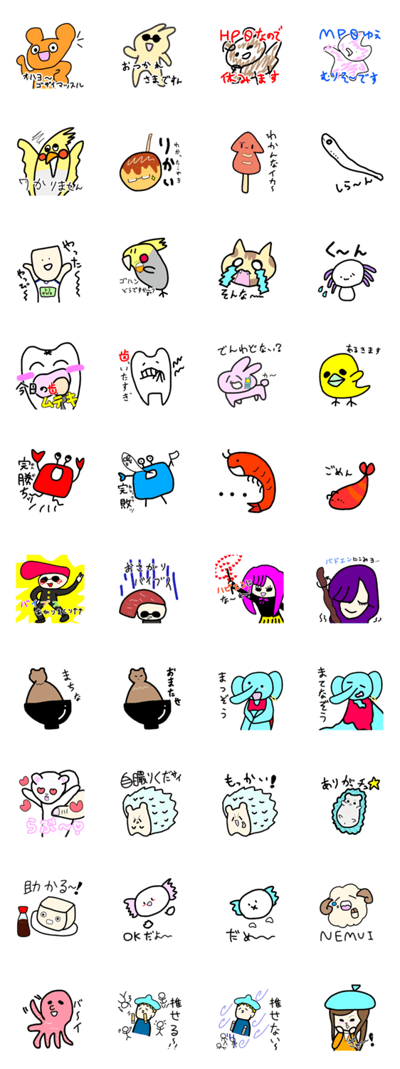 台詞がついて使いやすくなったヨ!ハリネズミ、猫、インコ、三角ベース、ウーパールーパー、熊、たこ焼き、イカ焼き、兎、タコ、カニ、リーゼント、豆腐、羊、フェレット