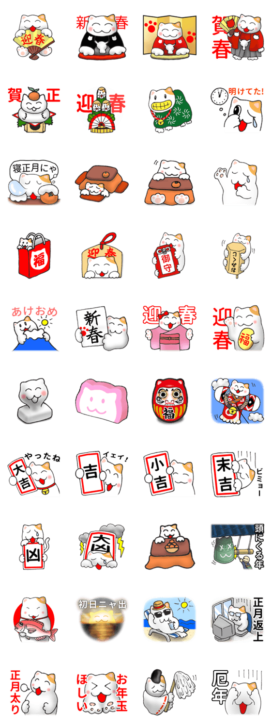 お年賀用のスタンプ。寝正月気味のにゃんこが新年のご挨拶(あけおめ・迎春・賀春・賀正など)を申し上げます。新春のお祝いにご利用下さいませ。