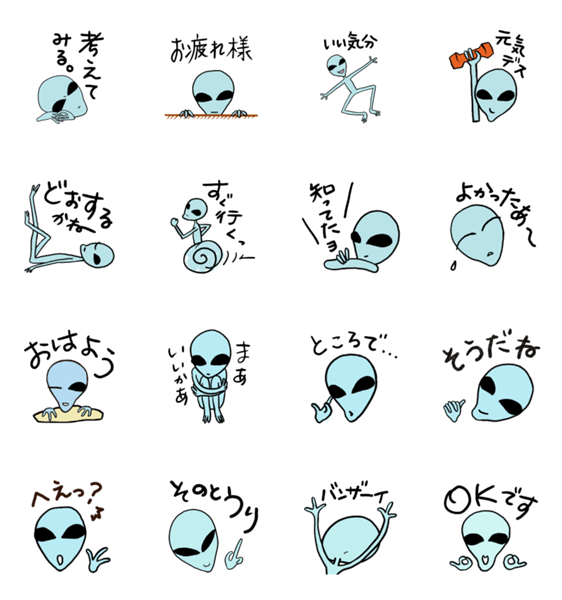 | スタンプ説明 | リトルグレイはすっかり地球の生活に慣れ、いろいろなメッセージを伝えています。 |