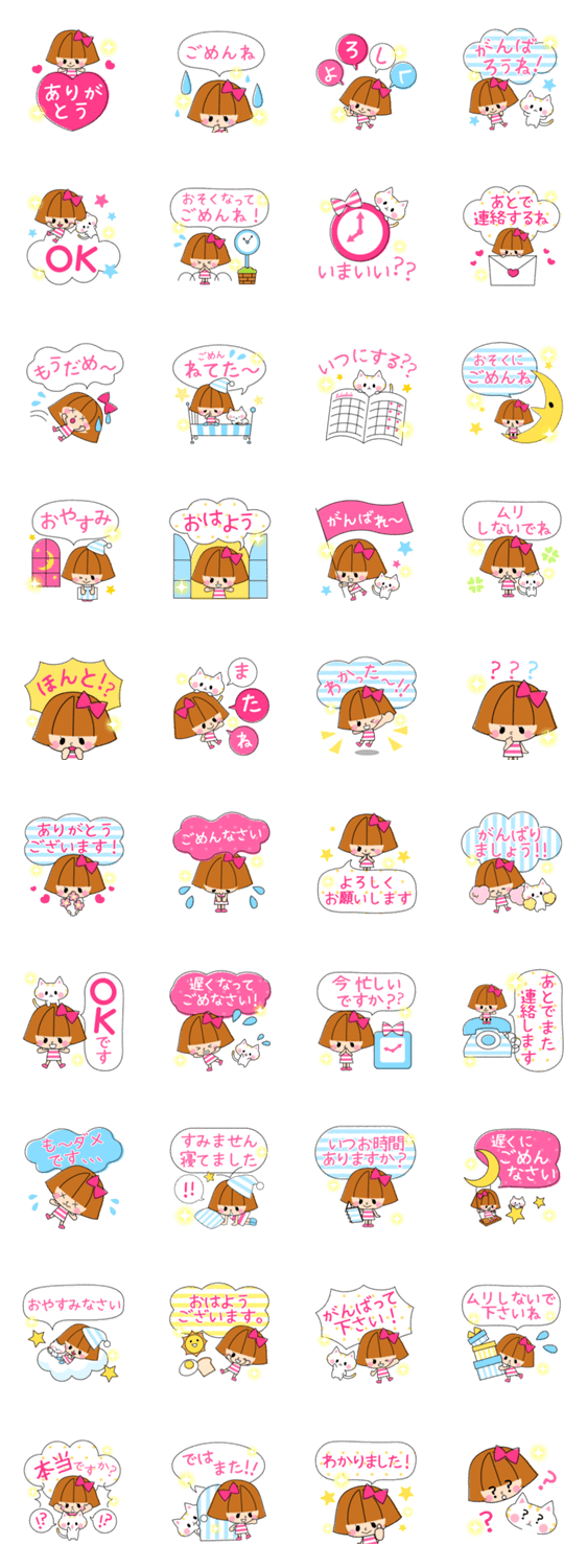 | スタンプ説明 | エリちゃんとネコのルルの使えるスタンプです。上の20個がタメ口、下の20個が敬語になっているので使い分けてね。 |