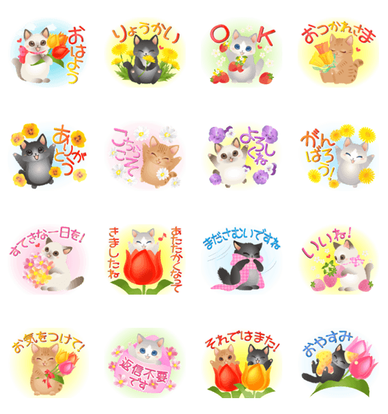 チューリップやパンジー、タンポポとふわふわねこたちが可愛く動く!春にぴったりのポップアップスタンプ!毎日使えるあいさつなど使いやすさも抜群です◎