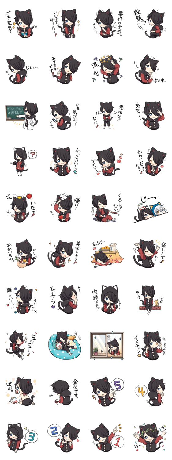日常会話やリアクションが入った、元気な黒猫少年のスタンプ第六弾です1~5、また『白猫少年』と合わせて使っても効果的です。もちろん単独でも使って頂けます。