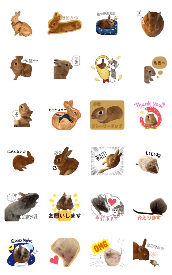 ウサギの『むぎ』、ハリネズミの『ハリー』、デグーの『ルゥ』のスタンプです。