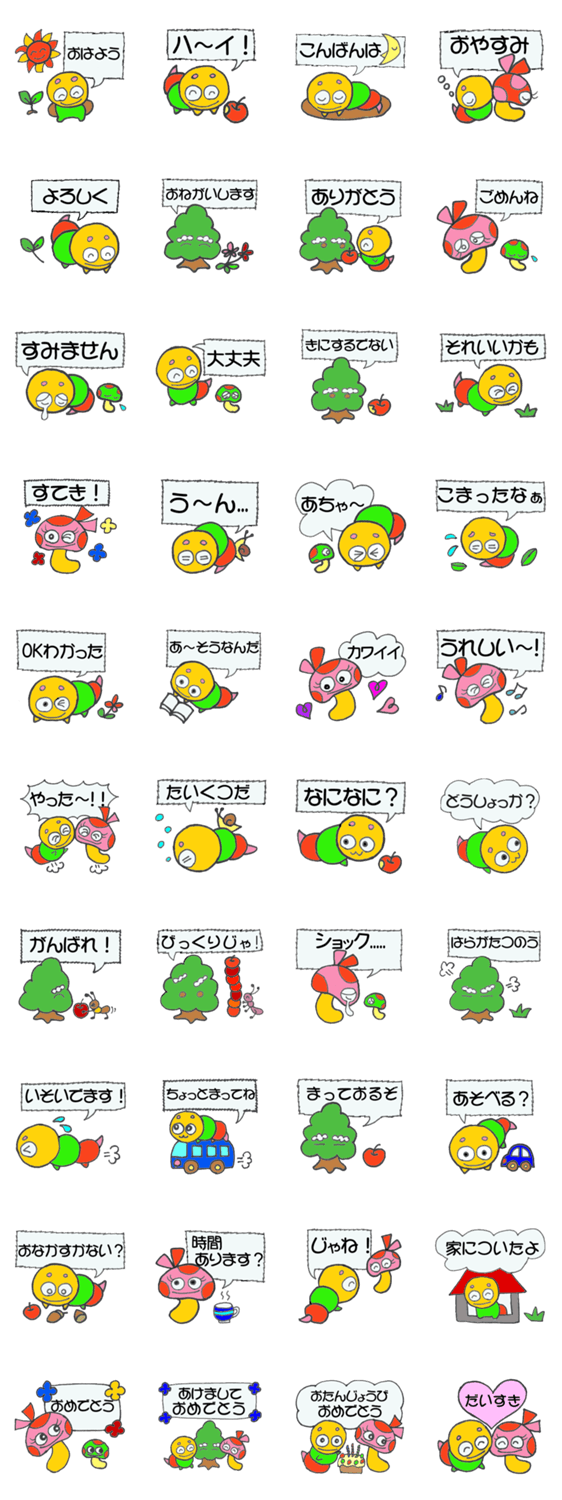 いもむしのきゃたぴ、キノコのマッシュ、森の妖精もりじいが、日常会話を楽しくします。かわいくてキュートな、誰にでも使いやすいスタンプです。