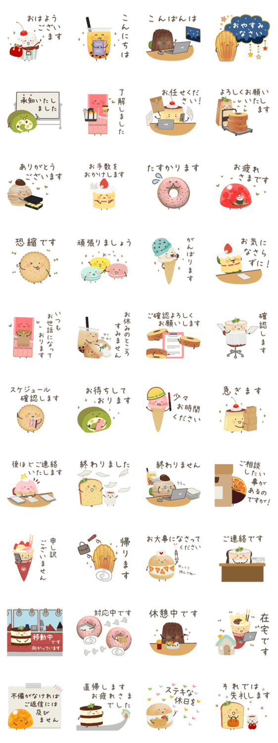 ゆるいスイーツたちの毎日使えるお仕事敬語スタンプです♡働くOLさん、パートさん、アルバイトさん、ママ友さん、PTAなどの連絡に使えます♪