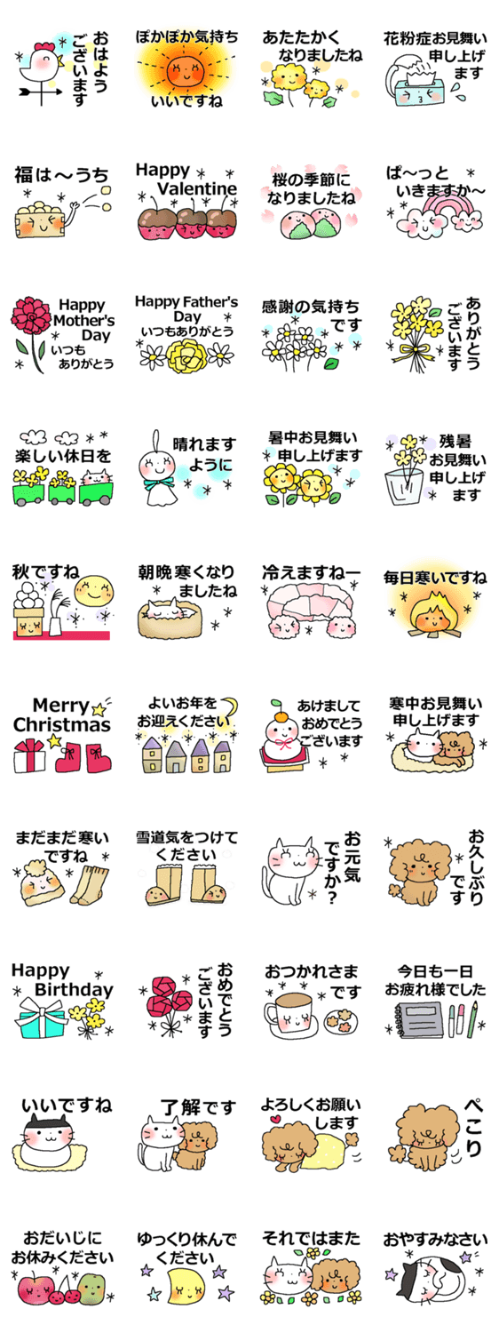 季節を感じるご挨拶、ひとこと添えるシンプルなスタンプです。文字がくっきり大きく見やすいのでサクっと送れて便利です。ほっこり癒しを猫とトイプードルが贈ります。