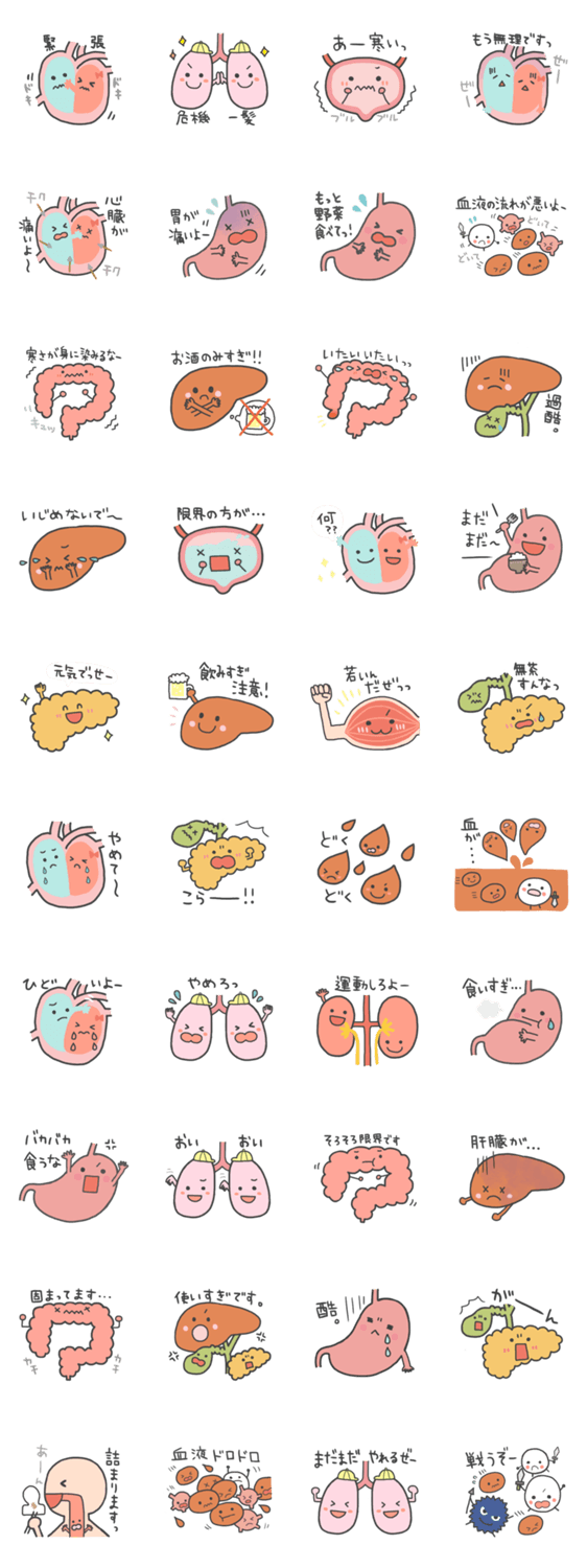 可愛い臓器たちに気持ちを込めて思いやりや忠告やいろんなものを伝えられる温かみのあるスタンプです。
