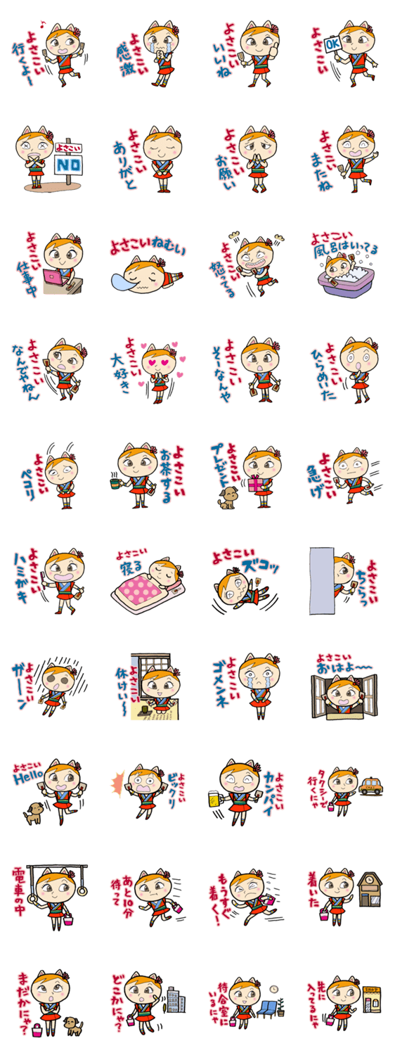 24時間よさこい生活の「よさこいニャンコ」。待ち合わせ用スタンプも付いて便利!よさこいの方もよさこいでない方もご使用ください。