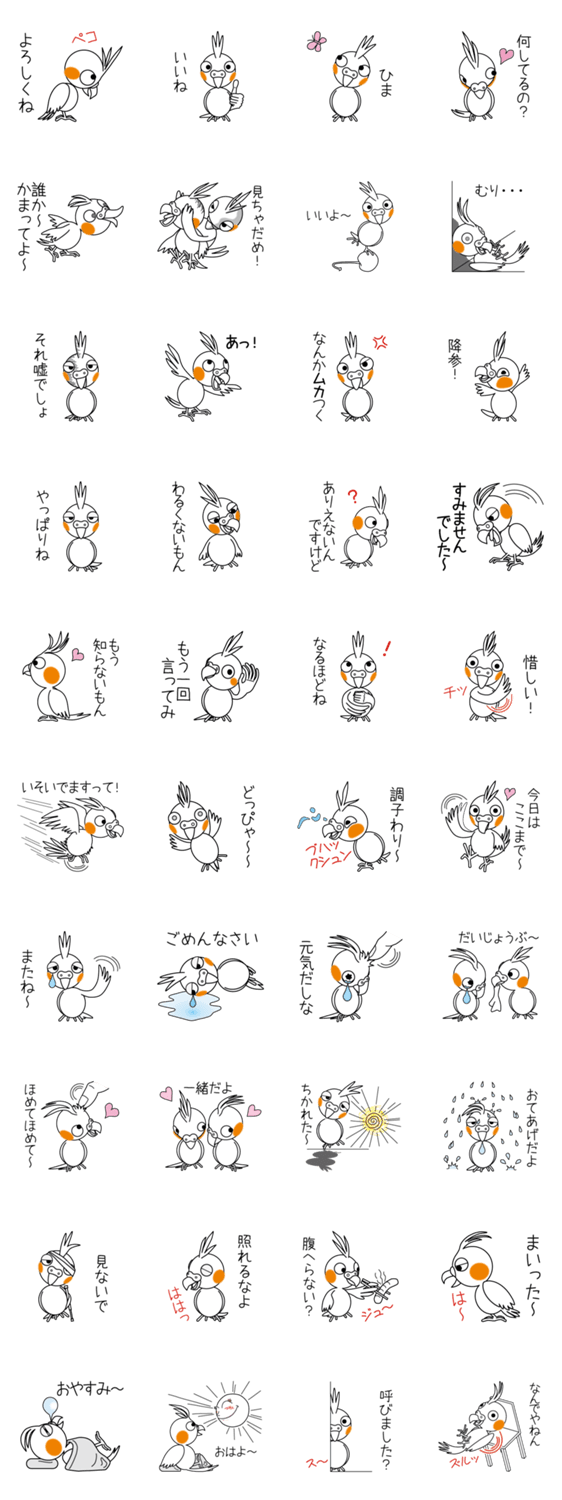 日常会話から色々なシーンで使えそうな、オカメインコさんぽいスタンプです。