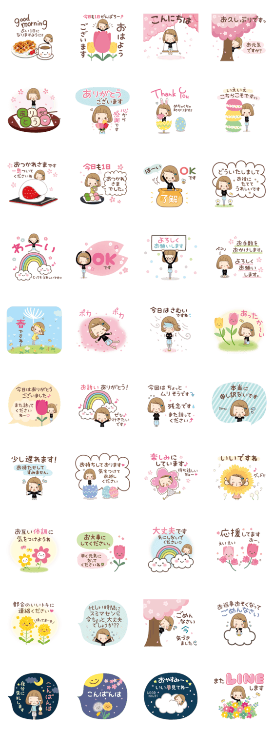 前髪短めな女の子の大人可愛い「春」の長文♡スタンプです♪ 春らしくてぽかぽかする♡心のこもった言葉や毎日の挨拶から、急いでる時にパッと送れるようなスタンプまで♪