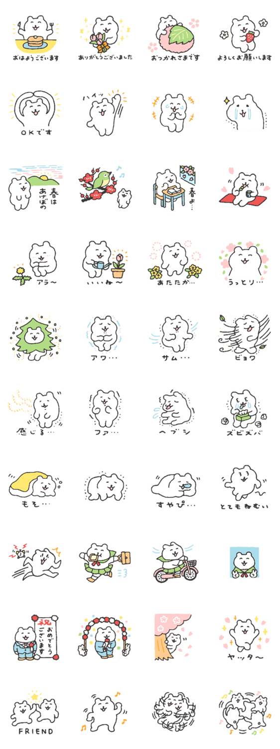 卒業、入学、新生活、花粉症と桜の季節・・・ あたたかな春のおとずれを感じつつ 毎日を過ごす すこやかなしろくまのスタンプです。