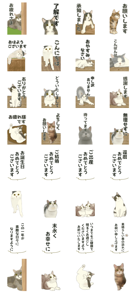 モフ猫ちゃんたちの大きな文字のスタンプです。 吹き出しと組み合わせて使えます。 (でか文字/猫/老眼/敬語/丁寧/あいさつ/ハチワレ/ハチワレ猫/友達/家族/還暦/便利) ※このスタンプはトークルームで大きく表示されるBIGスタンプです。