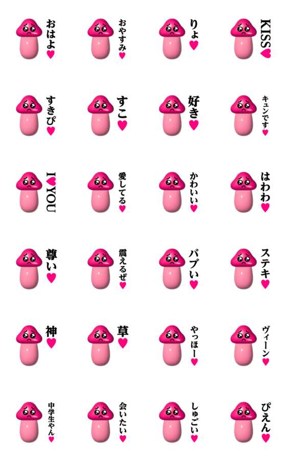 | スタンプ説明 | ぴえんMAX/ぴえんきのこ/ぴえん/ピエン/キノコ/茸/菌/元気/ピンクのキノコ/ぴんく/ラブラブ/大好き/毎日使える/挨拶/家族/カップル/夫婦/恋人/彼氏/彼女/アベック |