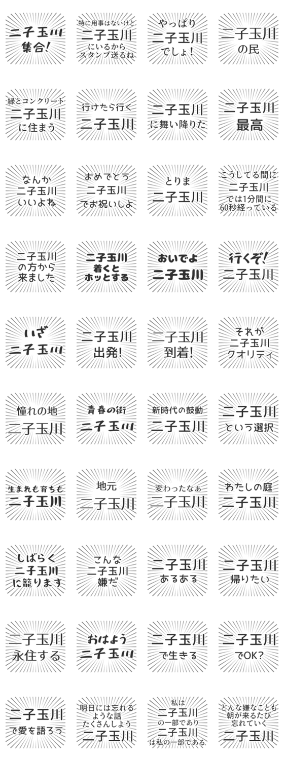 東京を舞台にした漫画風セリフスタンプ。集中線で叫べ。地元の人にも憧れてる人にも。面白いのが見つかると嬉しい。集中線。地元愛。ニコタマ。にこたま。