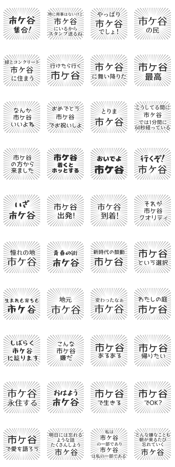 東京を舞台にした漫画風セリフスタンプ。集中線で叫べ。地元の人にも憧れてる人にも。面白いのが見つかると嬉しい。集中線。地元愛。