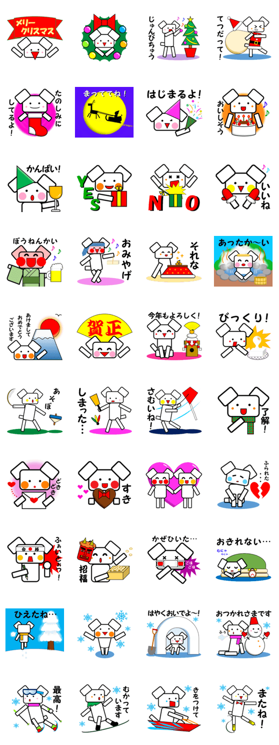 マクラのようなイヌのピローくん。クリスマスやお正月、バレンタインに使える冬のスタンプになったよ!家族やお友達に使ってほしいな♪