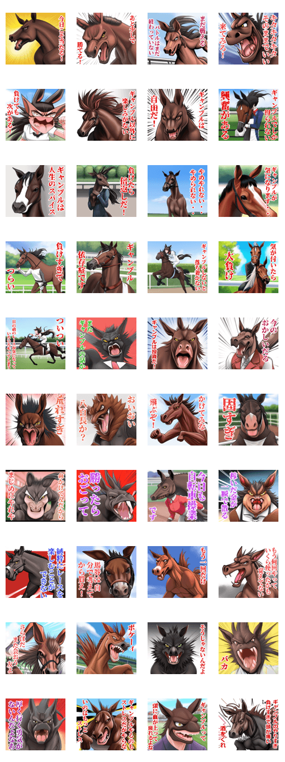 仲間内でも使えるよう送りやすく作りました。 ギャンブルが好きな人に送ってあげるとGOOD。 競馬ファンの方はもちろん、馬好きな人にも。 面白い表情にこだわりました。