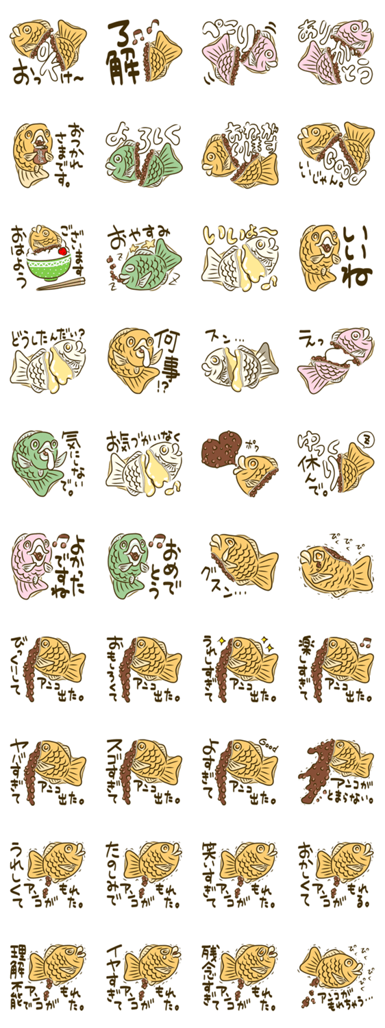 あんこたっぷり、お餅たっぷり、あんこで気持ち伝えるちょっとシュールで面白い鯛焼きのスタンプ。絵文字もあるよ♪ でか文字/デカ文字