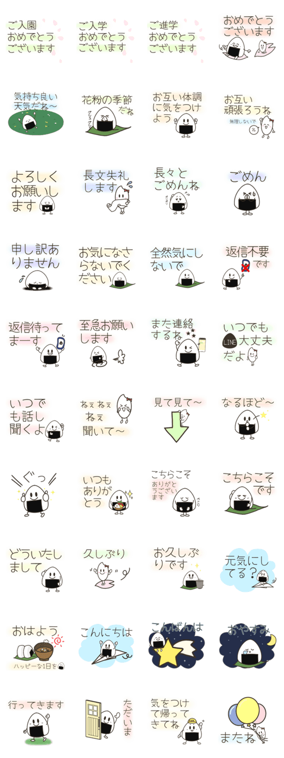 おむすびくんとおこめちゃんシリーズ 春を思わせる爽やかな色のスタンプにしました よく使う言葉もたくさんあるので使いやすいです♪