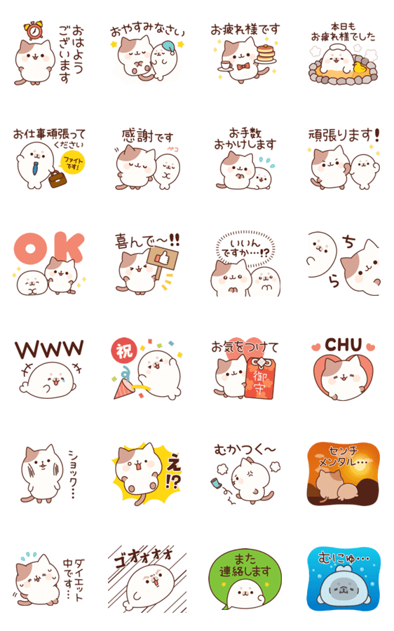 友達や家族、恋人に!ブチ猫とゴマフアザラシの赤ちゃんの可愛い飛び出るスタンプです♪